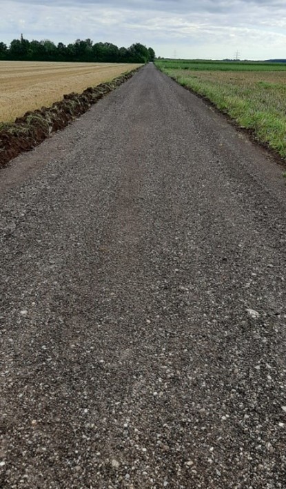 Spurrillen wurden mit dem Material von außen aufgefüllt, dadurch ist der Wasserablauf wieder gewährt und es entstehen keine Schlaglöcher. Zudem wird das Dachprofil intakt gehalten.