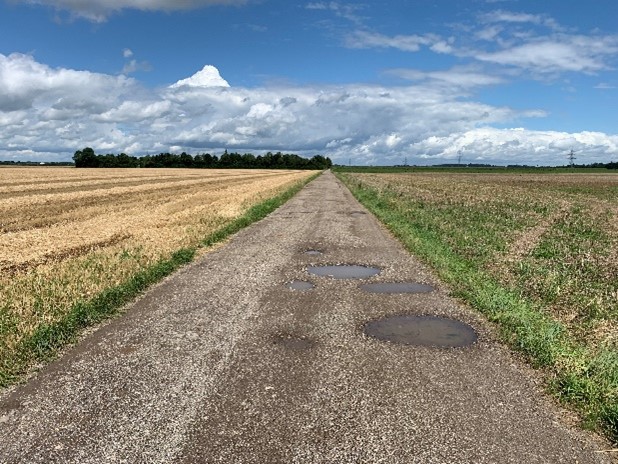 Extreme Spurrillen, in denen das Wasser steht bleibt, wodurch Schlaglöcher entstehen. Das Dachprofil flacht mit der Zeit ab.